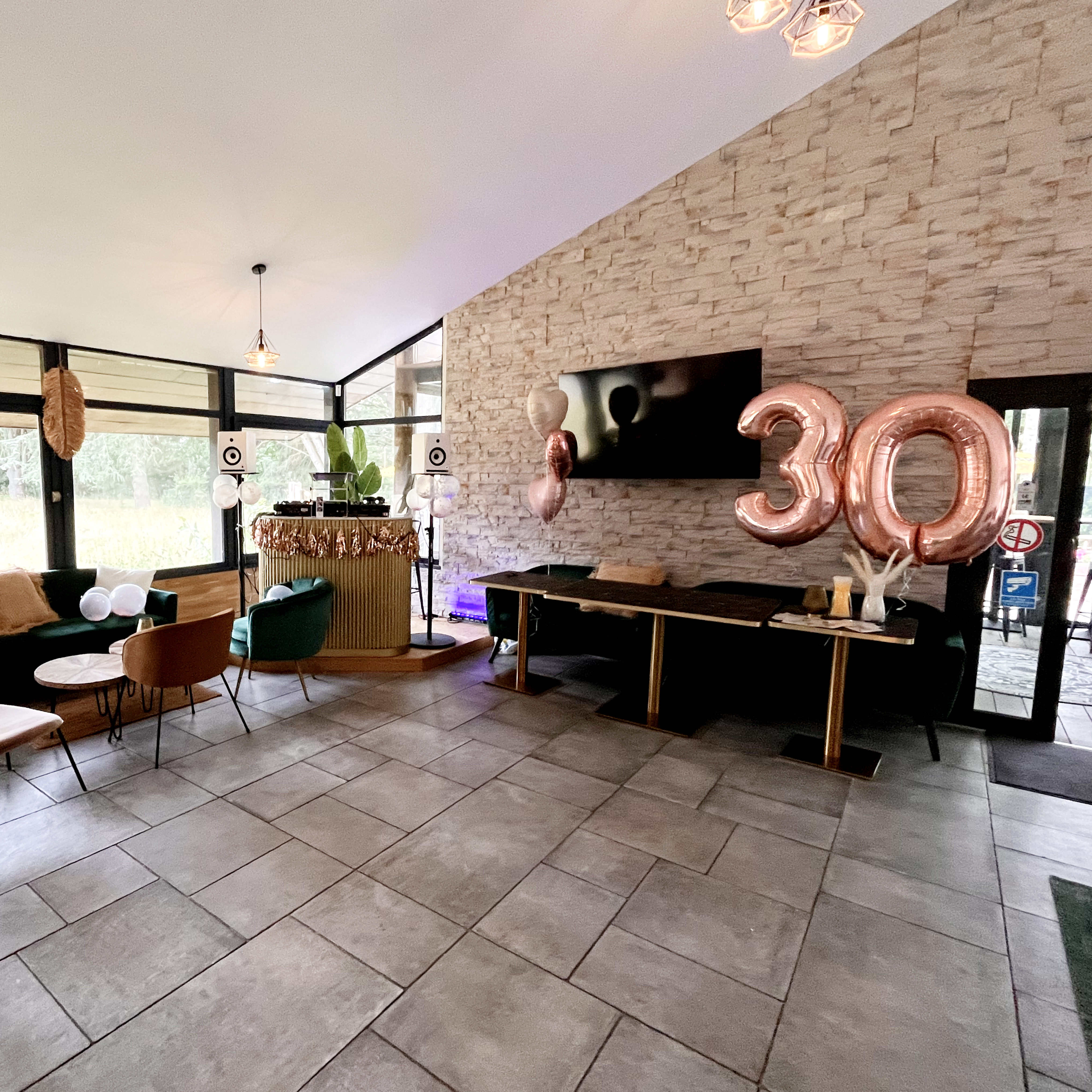 Côté intérieur, nous disposons d’une salle de 147 m² à la décoration travaillée, idéale pour votre repas d’anniversaire qu’il soit sous forme de buffet ou servie à l’assiette. Équipée de nombreuses places assises, d’écrans et d’un espace détente avec jeux de fléchettes, babyfoots. Enfin, vous trouverez aussi dans notre salle un espace DJ équipée de platines vous permettant d’accueillir votre propre DJ et de danser toute la soirée.